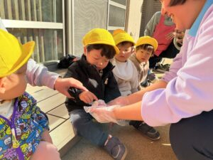 向日葵組と桜組はお餅つきの様子を見学したりお餅を触ったりして楽しみました!