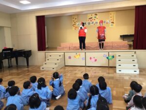 保育者からの出し物「猿蟹合戦」の劇を観た子ども達は、12月に開催されるクリスマス発表会に向けて「先生みたいに大きな声で台詞を言おう」と気合が入っていました。
