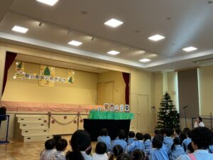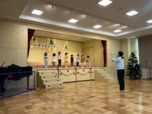 各クラスからの出し物では、椿組の「餅つき」や全体の歌「ジングルベル」「赤鼻のトナカイ」で可愛らしい振り付けを披露していました。
