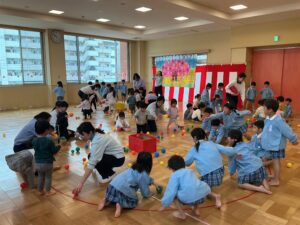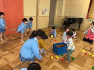 乳児クラスとの交流会では、カラーボール玉入れを行いました。