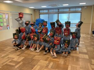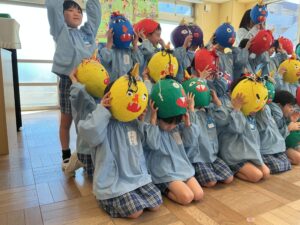 鬼退治できた後は自分達で作成した鬼のお面をつけて写真撮影!